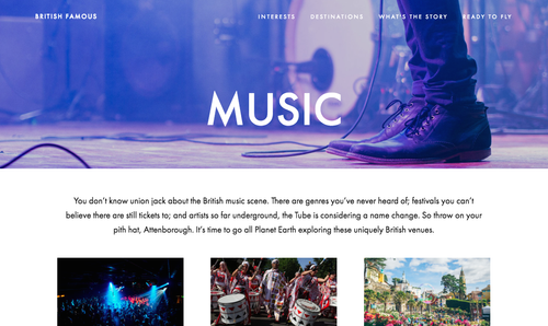 Objective: establish a presence for British Airways'/VisitBritain's "British Famous" campaign. The client requested a solution to allow for an accelerated timeline, and an OOTB platform was customized to accommodate desired content.